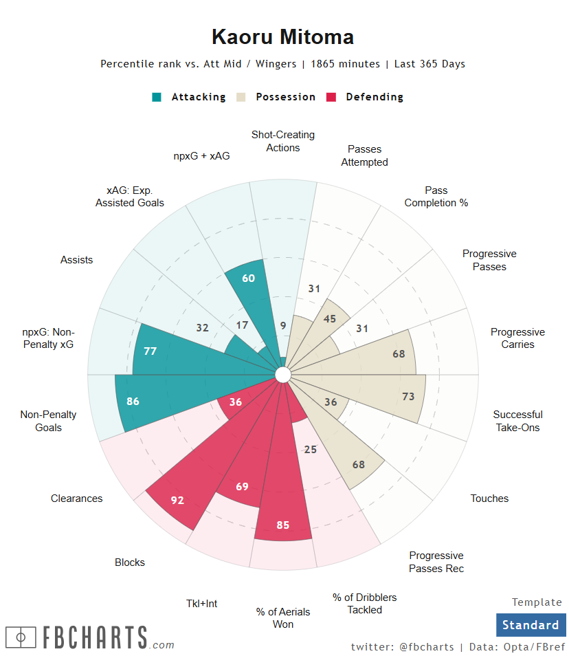 WGとして縦横無尽に動き、npxG 0.32(78%)の高精度シュートを放ちます。 プログレッシブキャリー 5.05(84%)とテイクオン成功 1.80(67%)で攻撃を推進するでしょう。 一方、合計シュート 1.97(36%)とSCA 3.01(21%)に留まり、シュート数とチャンスメイクに課題を残します。 守備ではブロック 1.66(97%)、タックル 1.56(75%)、インターセプト 0.48(62%)と高水準を維持するでしょう。 クリアランス 0.35(18%)の低さから、深い位置での守備判断と対応力向上が必要です。 プログレッシブパス 3.08(32%)拡大、クリアランス精度強化でさらなる完成度アップが見込まれるでしょう。総合すると、攻守両面で高いポテンシャルを示しながら、特にチャンスメイクと深い位置での守備精度を磨くことで、真のウインガーへと進化できるのです。